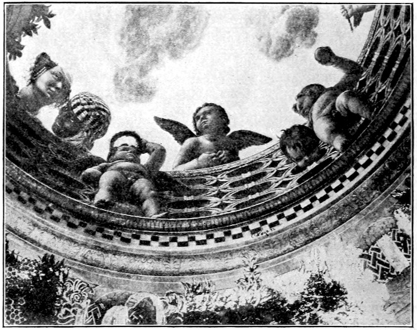 If the painter in tempera required chiefly patience and delicacy, the painter in fresco must have resolution and audacity. He must calculate each day’s work exactly, and a whole day’s work could be spoiled by a single slip of the hand in the tired evening hour. For fresco, the working sketch was roughly copied in outline on a plaster wall. Then any part selected for a day’s work was covered with a new coat of fine plaster. The effaced part of the design must be rapidly redrawn on the wet ground. Then the colors were laid on from their little pots, and only the sound mineral colors which resist lime could be employed. The vehicle was simply water. The colors were sucked deep into the wet plaster, and united with it to form a surface as durable as the wall itself. Generally the colors were merely divided into three values,—light, pure colors, and dark. Everything was kept clear, rather flat, and blond, highly simple and beautifully decorative. One of the later painters, Cennino Cennini (active about 1400), tells us that a single head was a day’s work for a good frescante. The touch had to be sure, for a mis-stroke meant scraping the wet plaster off, relaying it, and starting all over again. The fresco painter accordingly needed discipline and method. Nothing could be farther from modern inspirational methods. Where everything was systematized and calculated in advance, you will see it was quite safe for a master to entrust his designs to pupils who knew his wishes. Every fresco when dry was more or less retouched in tempera, but the best artists did this sparingly, knowing that the retouches would soon blacken badly or flake off.