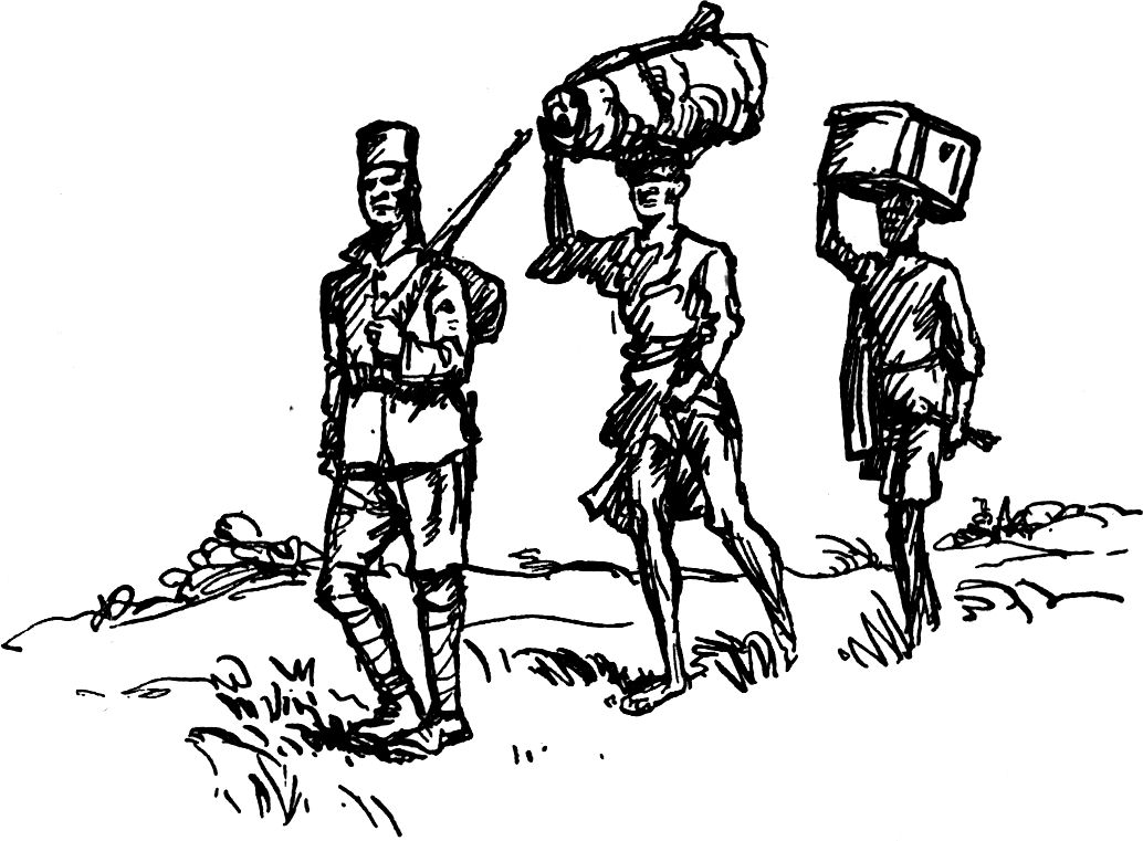 Von Yangallo nahm uns die Abteilung Klinghardt mit zurück zu dem alten Karawanenzentrum Mpapua. Das Hauptereignis der vier oder fünf Tage, die wir da gelegen haben, war, daß wir einige fette Schweine schlachteten und alle unsere Blechbüchsen und Gläser mit Schmalz auf Vorrat füllten. Hocherfreulich war es, daß es in Mpapua auch Schneider gab, die unser Gelumpe notdürftig reparieren konnten. Ich habe meinen einzigen Uniformrock, der mir, nebenbei gesagt, viel zu klein war, dort mit vier Taschen besetzen lassen; denn im Original hatte der Rock merkwürdigerweise überhaupt keine Taschen. Da der Khakistoff der Taschen, den mir ein wohlhabenderer Kamerad geschenkt hatte, viel heller war als der Stoff des Rockes, sah ich von vorne allerliebst scheckig aus und von hinten, wegen der Kürze des Rockes, wie ein Junge in schweren Reithosen – Wellblechhosen wurden sie genannt –, der aus seinem kurzen Jäckchen[206] seit einigen Jahren herausgewachsen ist. Na – die Eleganz eines Etappesoldaten konnte von uns billigerweise nicht verlangt werden.