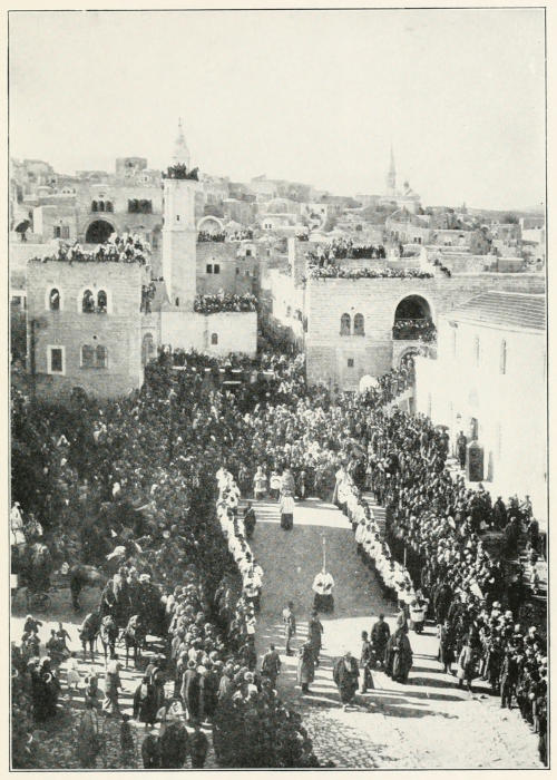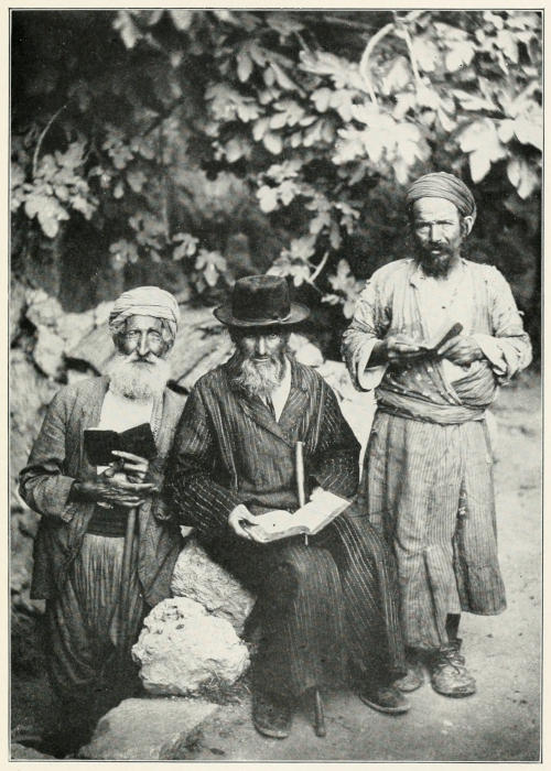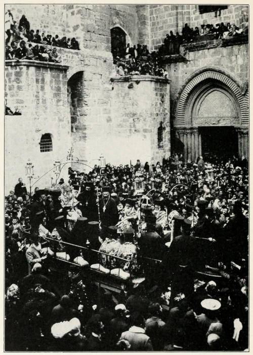 At Jerusalem I saw a large number of Armenian pilgrims who had come from all parts of Asia Minor to pray at the Church of the Holy Sepulchre. They have a Patriarch at Jerusalem who leads them in these celebrations. He is a tall, thin man with a long gray beard and a face not unlike that of the typical Georgia cracker. He usually wears a long gown and has a little skull cap on the crown of his head. During the Easter celebration he wears a tiara blazing with diamonds and his gown is a gorgeous silk robe decorated with diamonds. The Armenian Christians have doctrines much like those of the Greek Church. They have monasteries and churches scattered throughout Asia Minor.