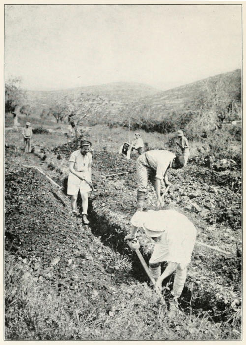 Before the British came the Arabs had a saying that the Turk would rule the Holy Land until the Nile flowed into Palestine. This ancient prophecy has been almost literally fulfilled, for when the British built the military railroad from Egypt into Palestine they laid all the way beside it a pipe-line carrying water pumped from the Nile. A great tank in the hills on the Hebron road, built by Pontius Pilate, has been restored, and now holds five million gallons of water, which is piped into Jerusalem. The streets have been cleaned, the beginnings of a sewerage system put in, and the natives have started to learn the use of a covered garbage can. Even the mosquitoes, descendants of those who bit the Crusaders, have been driven out and have gone to the other side of Jordan to smite the Bedouins. Plans for the further extension of the city beyond the walls have been prepared, and its growth will be directed accordingly.