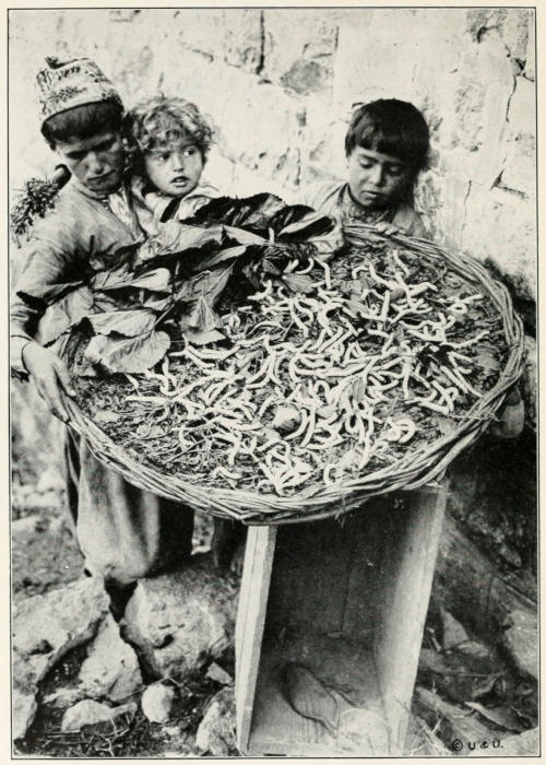 Syria and Asia Minor are now raising a great deal of silk, which is sent to France and shipped from there to the United States. The American residents tell me that there is no reason why we should not buy this raw silk direct, thus saving the Frenchman’s profits and the double transportation charges. I saw mulberry orchards everywhere during my travels in Syria. The plains about Beirut are covered with them, and they are to be found on both sides of the Lebanon Mountains. When the trees have grown to the height of a man’s head, they are cut back. Green leaves from the new sprouts furnish food for millions of silkworms. In coming from Damascus I saw women and children picking the leaves to feed to the worms, carrying them to sheds erected for the purpose. Raising the silkworms is largely in the hands of the women, who take care of the trees and sell the cocoons. From the Lebanon mountain regions every year men, specially appointed, go to France to get the silkworm eggs.[269] For some reason those laid in the Syrian mountains do not produce well.
