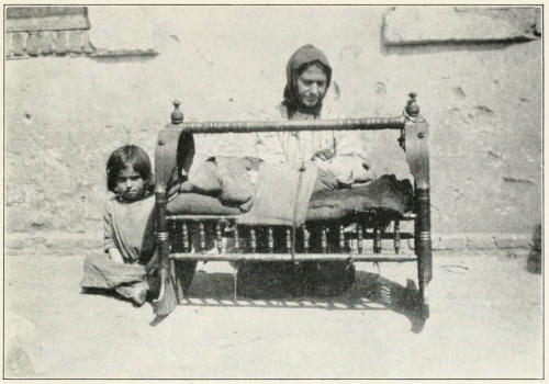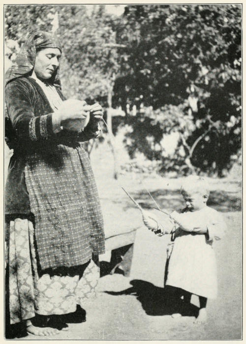 Armenian girls are married very young. Eleven or[278] twelve is considered quite old enough, and women still young often have sons twenty years old. Marriages are arranged by parents or by go-betweens. The usual wedding day is Monday, and on the Friday before the marriage the bride is taken to the bath with great ceremony. On Saturday she gives a big feast to her girl friends. On Sunday there is a feast for the boys, and on Monday the wedding takes place. It usually occurs at the church, where the priest blesses the ring and makes prayers over the wedding garments. The numerous other ceremonies make the wedding last from three to eight days. Shortly after her return from the church the children present rush to pull off the bride’s stockings, in which have been hidden some coins for the occasion. Another curious custom is to place a baby boy on the knee of the bride, as she sits beside the groom on a divan, with the wish that she may become a happy mother.