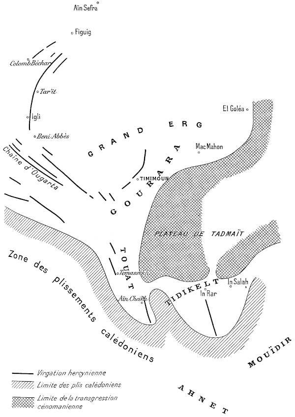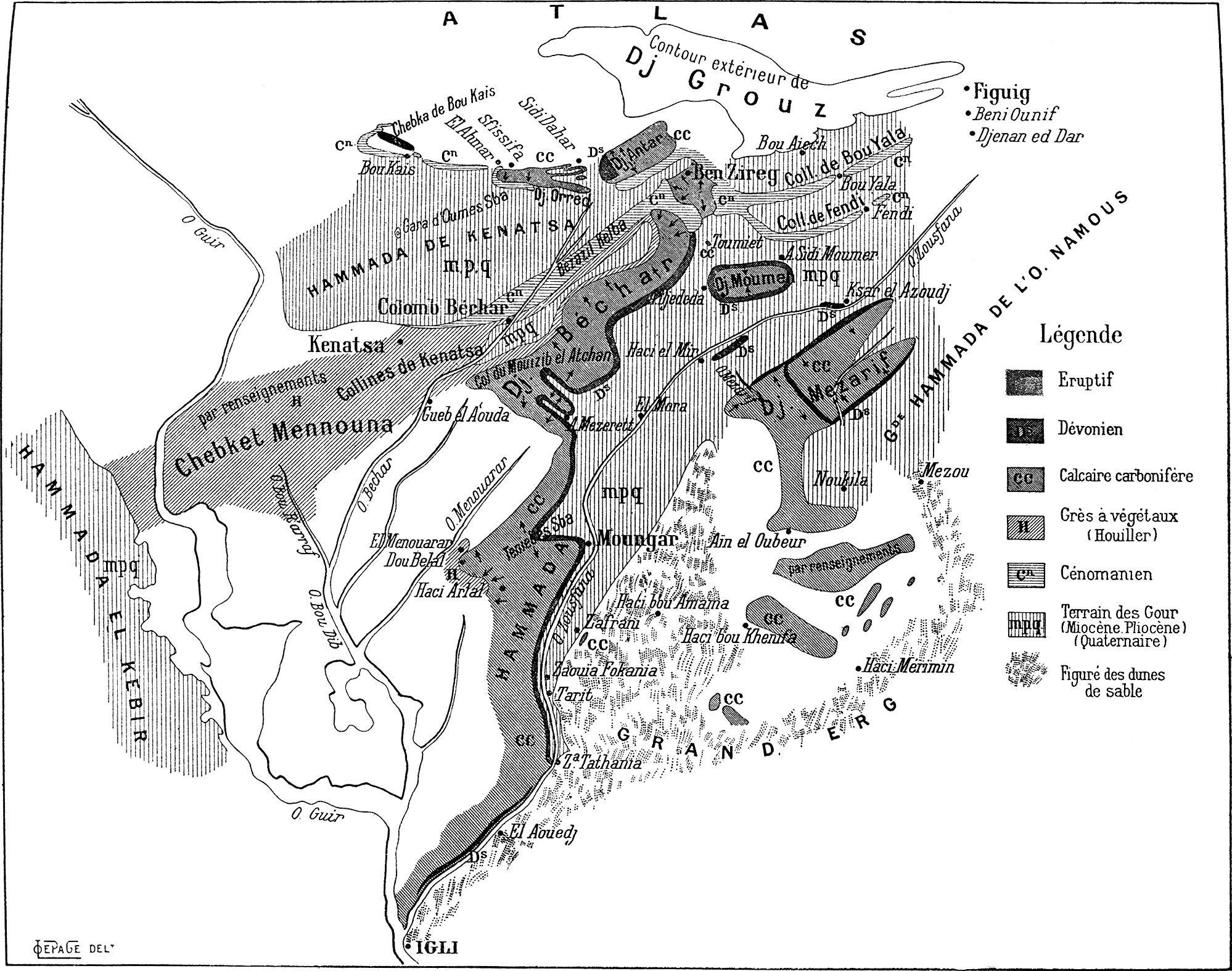 Dans un ouvrage où j’ai donné une place considérable à l’étude géologique et plus spécialement stratigraphique on pourra s’étonner que la paléontologie soit à peu près complètement absente. Pourtant un grand nombre de fossiles ont été recueillis. Ceux qui se rapportent à l’âge carboniférien, encore qu’intéressants par la nouveauté des gisements, ne nous apprennent rien de nouveau sur la faune dinantienne au Sahara. Les fossiles dévoniens en revanche sont apparemment intéressants, surtout ceux des étages supérieurs, puisque M. Haug, dans le laboratoire de qui ils ont été déposés, va leur consacrer une monographie.