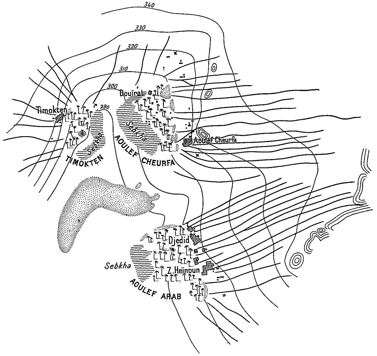 Les premiers sont relégués dans un appendice ; il est vrai qu’ils ont été utilisés pour l’établissement des deux cartes, qui accompagnent les chapitres II et VII ; il est vrai aussi que ces deux cartes font ressortir quelques faits nouveaux et intéressants (cours de l’O. Messaoud, dessin de l’Açedjerad, position[ix] d’Ouallen). Ces itinéraires originaux n’en sont pas moins une faible fraction de l’itinéraire total parcouru, et leur originalité d’ailleurs n’est pas toujours entière. C’est que les officiers des oasis ont fait une besogne topographique énorme et excellente, et qui a été en grande partie publiée. On la trouvera éparse dans les suppléments au Bulletin du comité de l’Afrique française. Elle a été synthétisée dans deux cartes récentes : Carte provisoire de l’extrême-sud au 1/800000, dressée à l’aide des documents topographiques existant dans les archives du gouvernement général par M. le capitaine Prudhomme. Carte des oasis sahariennes, 1/250000, par MM. le lieutenant Nieger et le maréchal des logis Renaud (Paris, 1904). D’une façon générale je renvoie le lecteur à ces deux cartes.