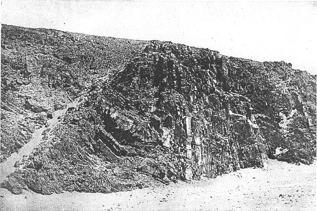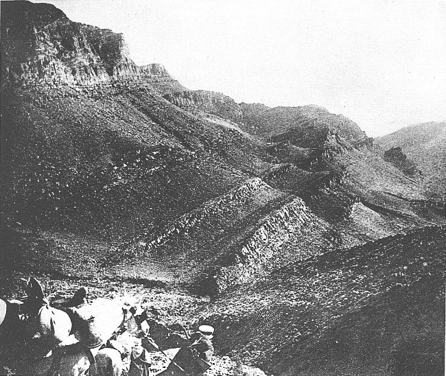 XLVIII. — 88. Près de l’oued Adjam. La muraille de grès éodévoniens basculée au nord d’Adoukrouz 294-295