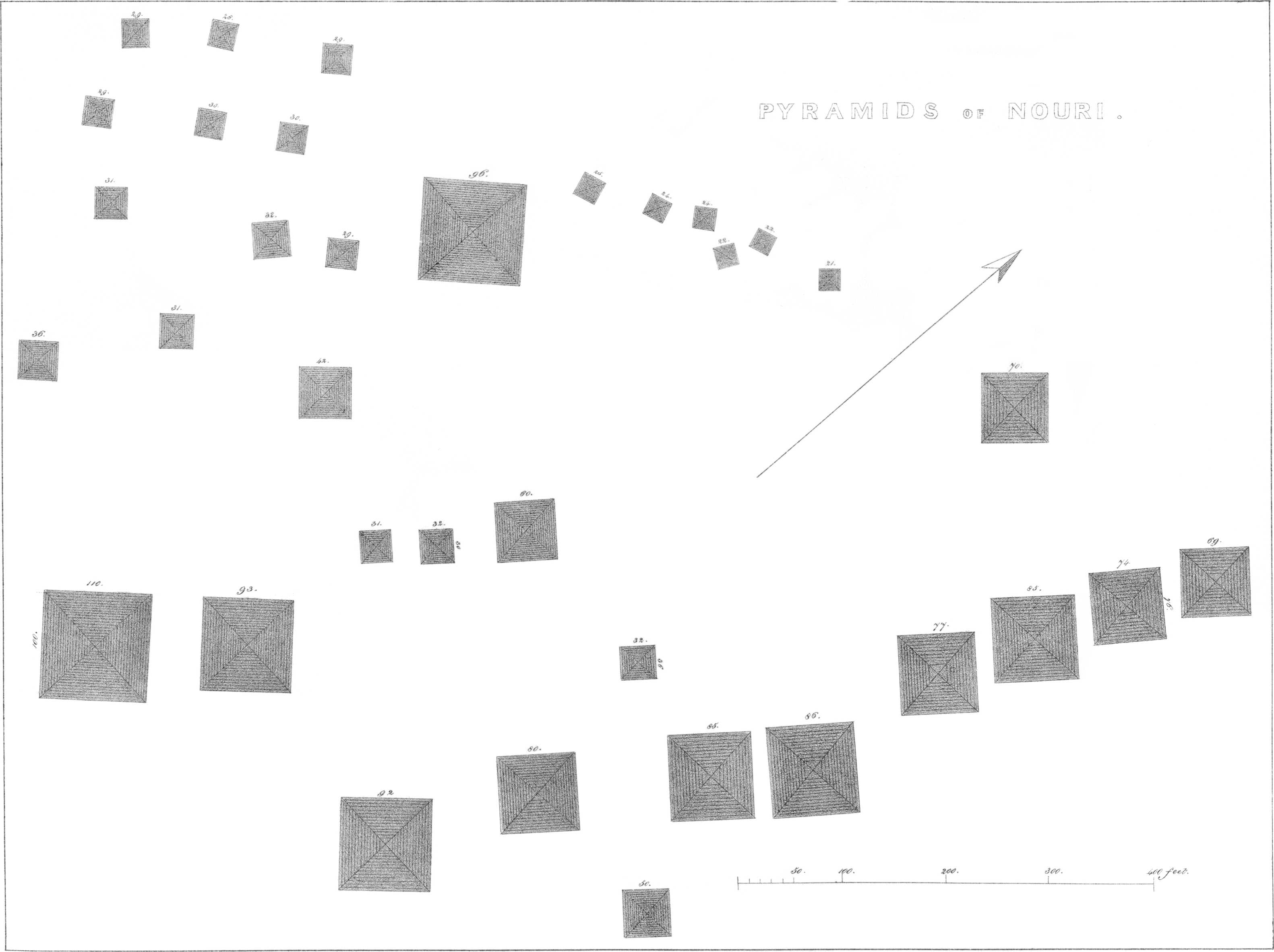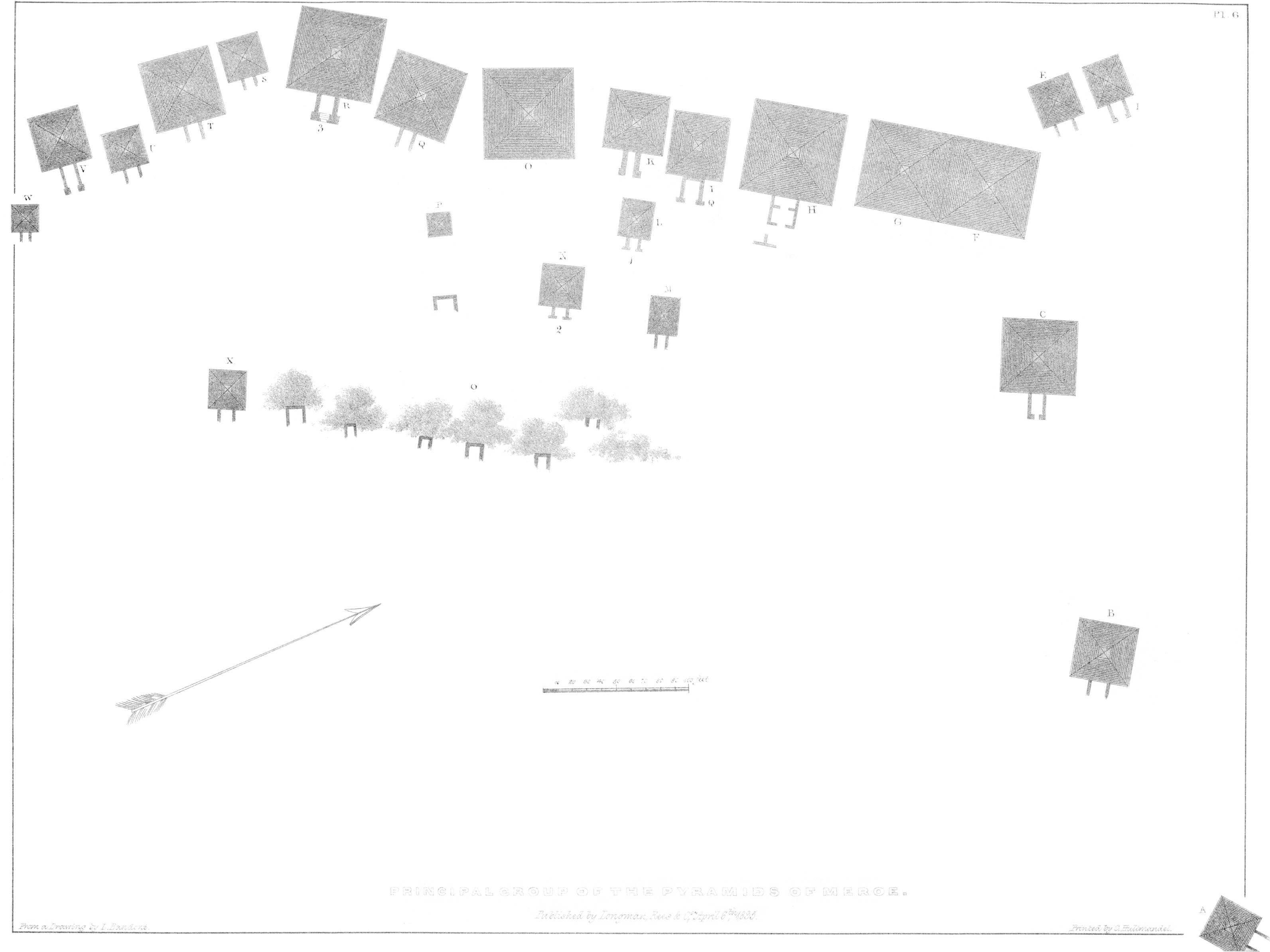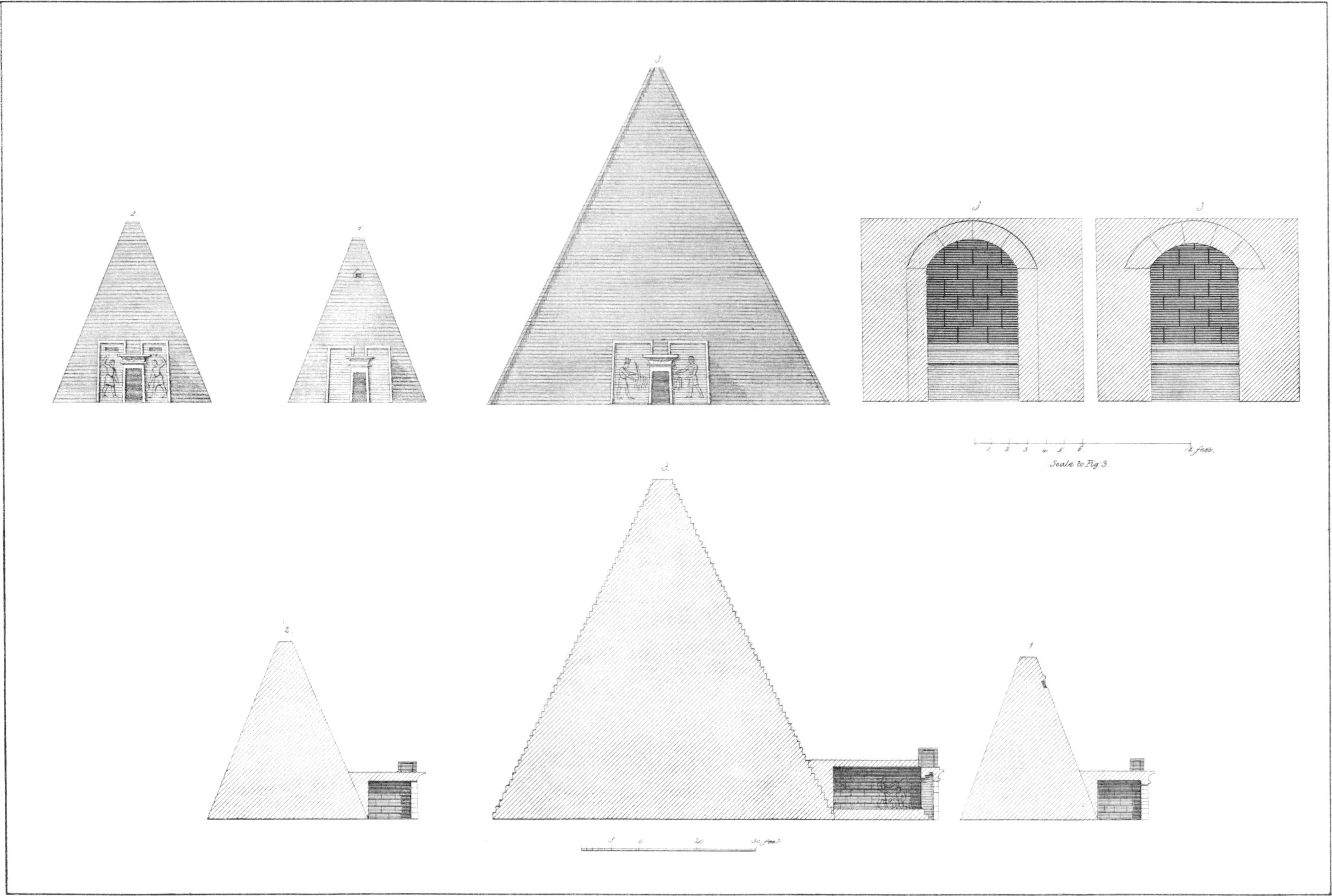 [27]The generality of the pyramids face a little to the south of south-east. I regret to state, that, from an error of the engraver’s, which I did not discover until all the copies were printed off, their direction is not correctly marked in the General Plan; but, as their position is accurately shown in the above vignette, I have considered it unnecessary to incur the expense of having the plate reprinted.