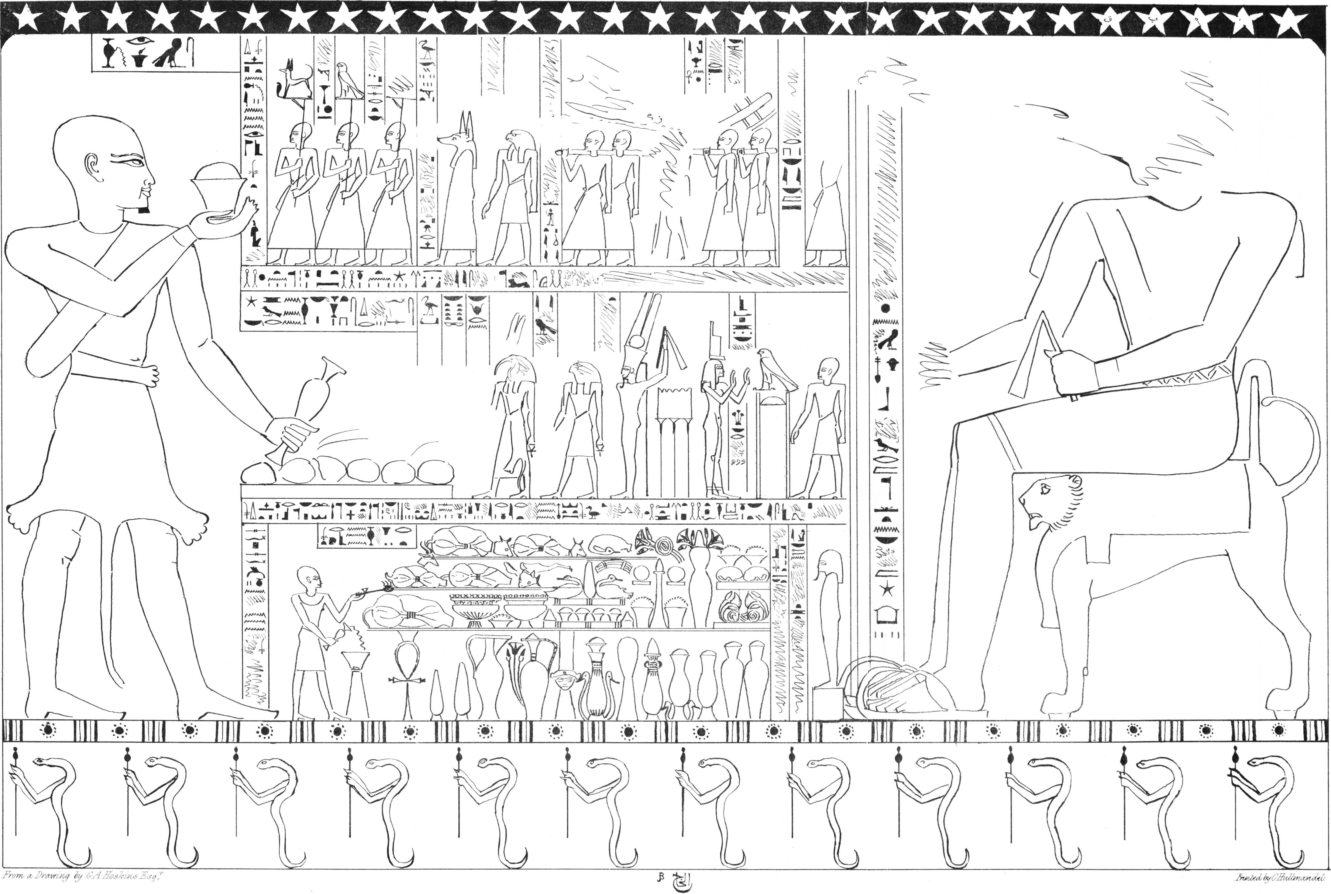 [85]I regret that in some few of the impressions the caps were printed black. The reader must be aware, that the management of such engravings as these is excessively difficult. Four colours are impressed from separate stones—red, blue, black, and the ground. The others were put in by hand. I took great pains in superintending the mixing of the colours, to give the reader as exact a representation of an Egyptian painting as was in my power. I am indebted to Mr. Bonomi for having drawn for me on the stones these and the other plates of sculpture.