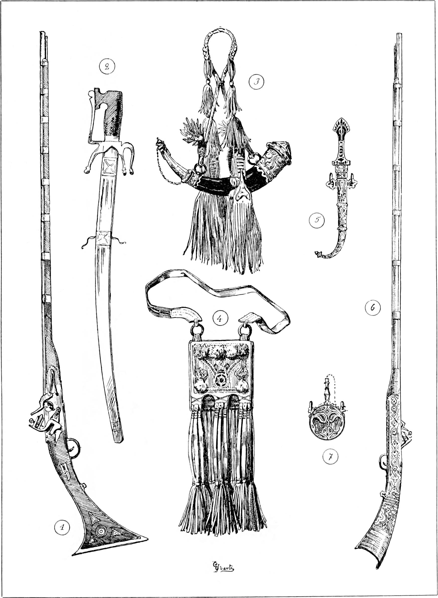 Dans cette tribu, aussi bien que chez les Akhmâs, les costumes sont les suivants : pour les hommes de condition aisée : caleçons étroits s’arrêtant au-dessus du genou, courte chemise sans manches, en laine blanche, descendant jusqu’à mi-cuisse, enfin djelabia brune ; comme chaussure, la belṛa[13] jaune ; comme coiffure, une calotte rouge. Cette dernière se supprime souvent : dans tout le Maroc, les populations des campagnes ont d’habitude la tête nue, quelque soleil qu’il fasse, et bien que la plupart se rasent les cheveux. Les pauvres n’ont qu’une chemise de laine blanche et une djelabia ou un court bernous de même étoffe ; rien sur la tête, ou bien quelque chiffon blanc ou rouge noué autour, laissant le crâne à découvert ; les pieds nus ou chaussés de sandales. Ici, par exception, peu de cheveux sont rasés : on se contente de les porter très courts. Rien de particulier dans le costume des femmes : elles ont celui quelles portent dans les campagnes du Tell algérien ; il est uniformément en laine ou en cotonnade blanches ; toutes laissent leur visage découvert ; pour travailler aux champs, elles s’enroulent autour des jambes un épais morceau de cuir fauve fixé sur le devant par une agrafe : c’est quelque chose comme les cnémides que mettait Laërte pour jardiner.