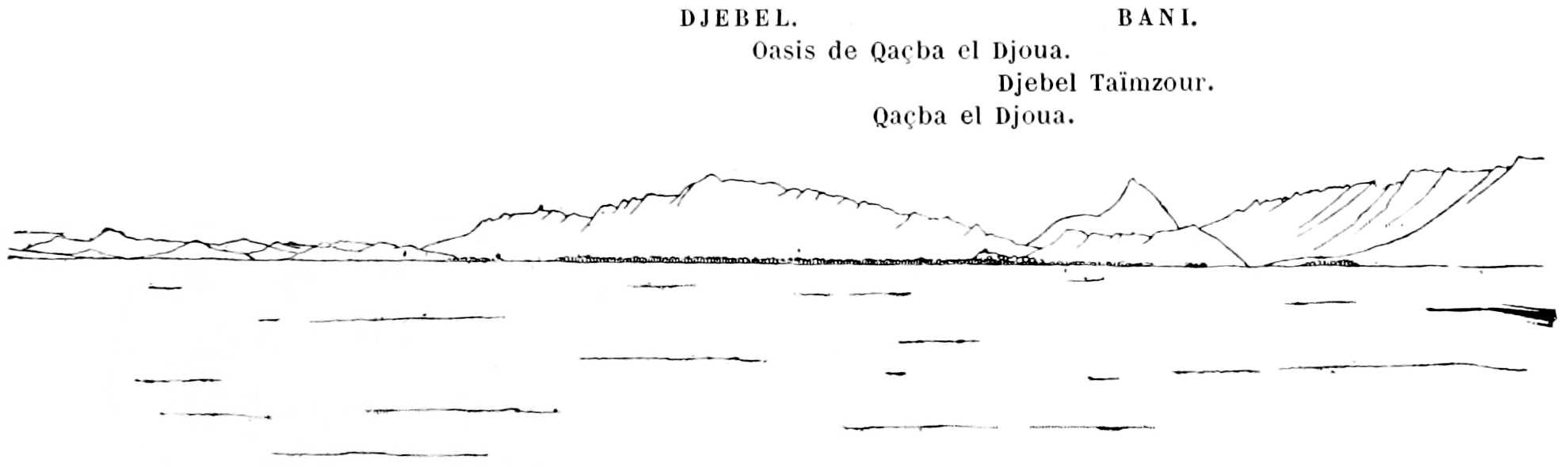 Pendant cette dernière partie de ma route, j’ai encore rencontré beaucoup de personnes sur le chemin. Celui-ci ne cesse pas d’être bon : une seule côte un peu raide, aucun passage difficile. Sol terreux, peu de pierres. J’ai traversé deux cours d’eau assez importants : l’Ouad Arezaz (berges de terre d’un mètre ; eau claire et courante de 60 centimètres de profondeur ; 8 mètres de large ; lit de galets), et l’Ouad el Ḥechaïch (il coule à pleins bords dans un lit de gravier de 10 mètres de large ; eau claire et courante de 60 centimètres de profondeur). Le Djebel Mezedjel, identique au Djebel Beni Ḥasan, n’est que la continuation de celui-ci sous un autre nom : on le voit se prolonger bien loin encore dans le sud, appelé alors Djebel el Akhmâs.