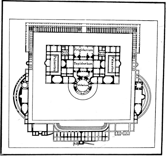 [196] The great Baths of Caracalla (built circ. 215 A.D.) and those of Diocletian (circ. 300 A.D.) were not in existence, of course, in the days of Hadrian. Their ruins are at present among the most imposing in Rome, and they were probably somewhat larger than the Baths of Trajan, which are to-day nearly demolished, but their aspect and general arrangement were hardly different.